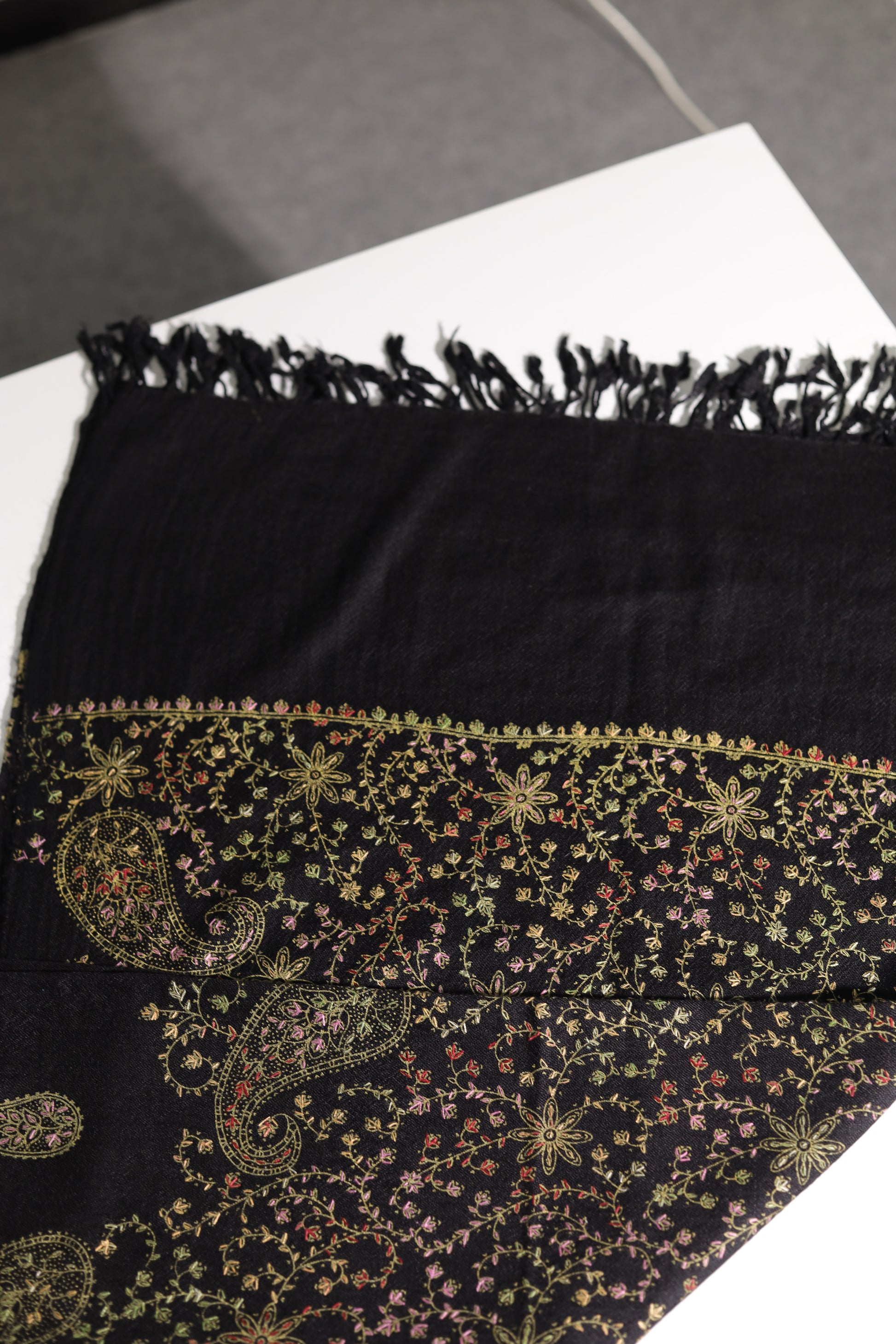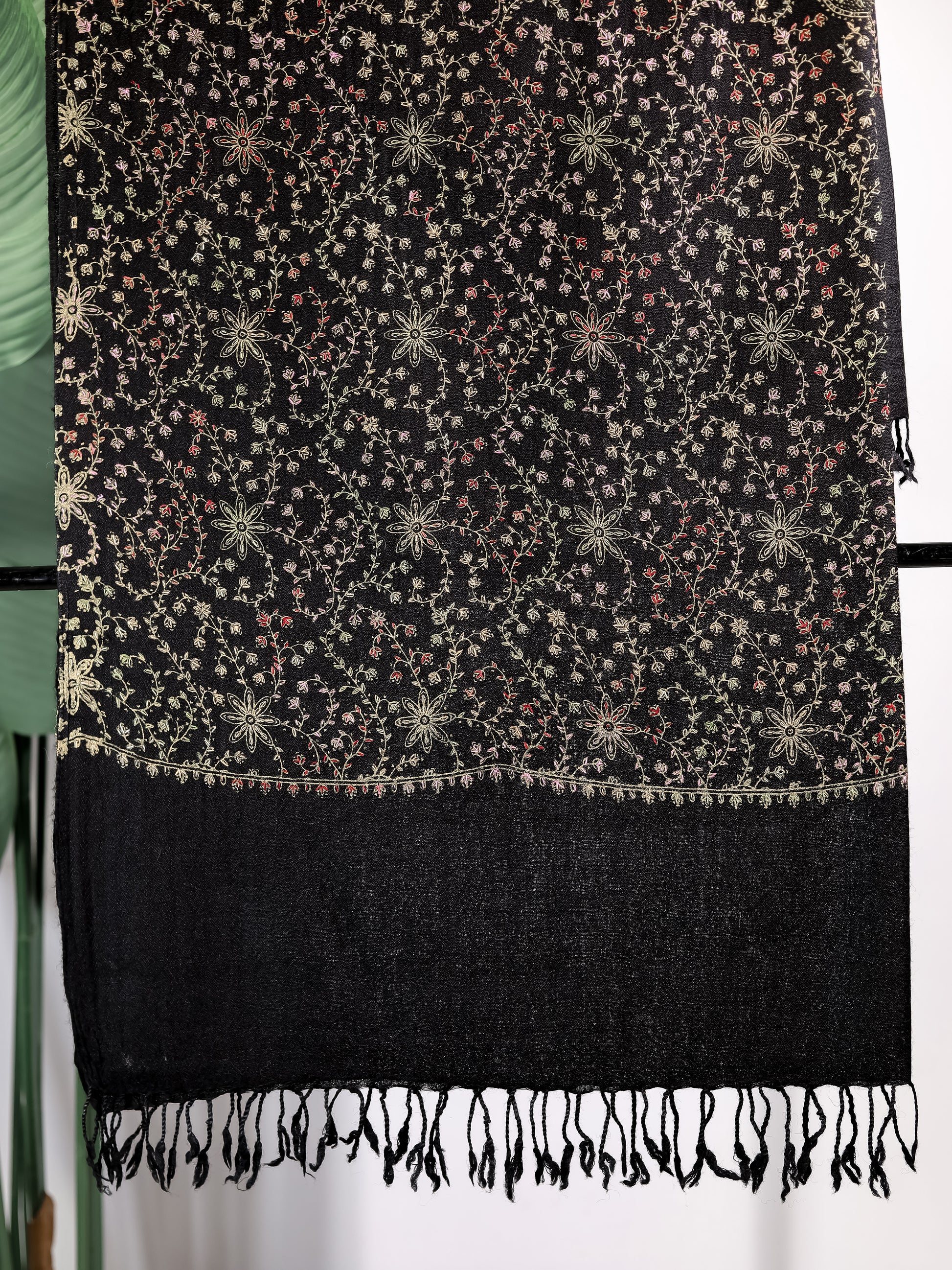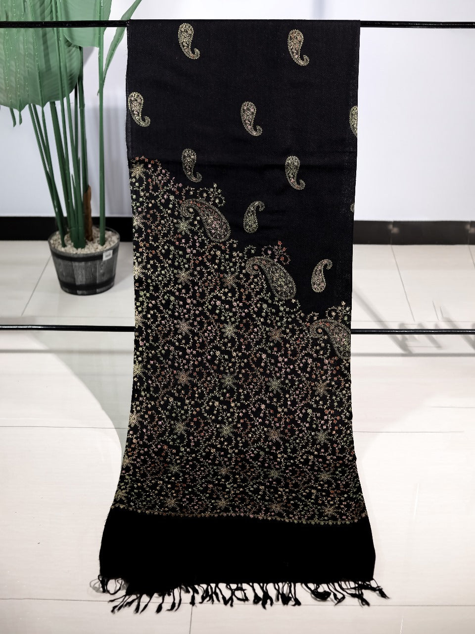 Designed to elevate every occasion, Zehba combines timeless tradition with contemporary flair. Its cascading pattern transitions with elegance, offering visual richness without overwhelming detail. The perfect evening shawl — refined, versatile, and remarkably luxurious.