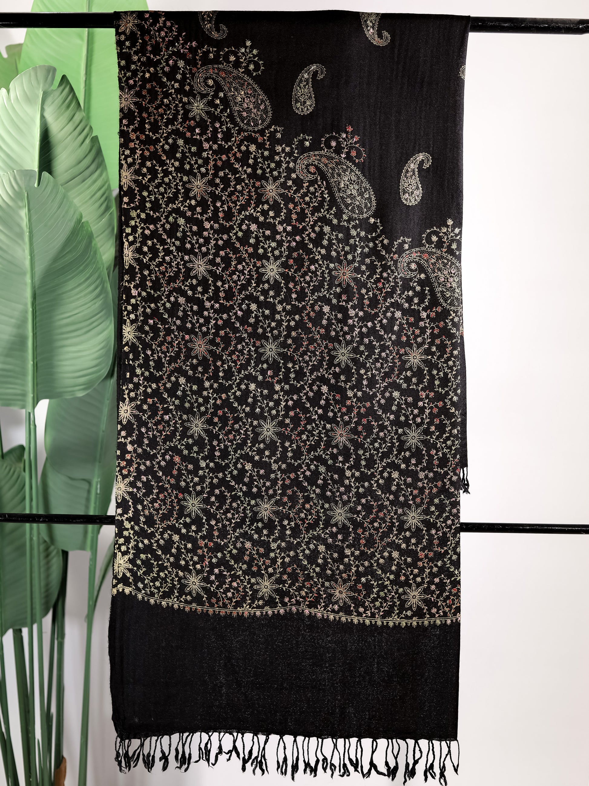 A classic black canvas brought to life with ornate, all-over paisley embroidery in soft gold and maroon threads.