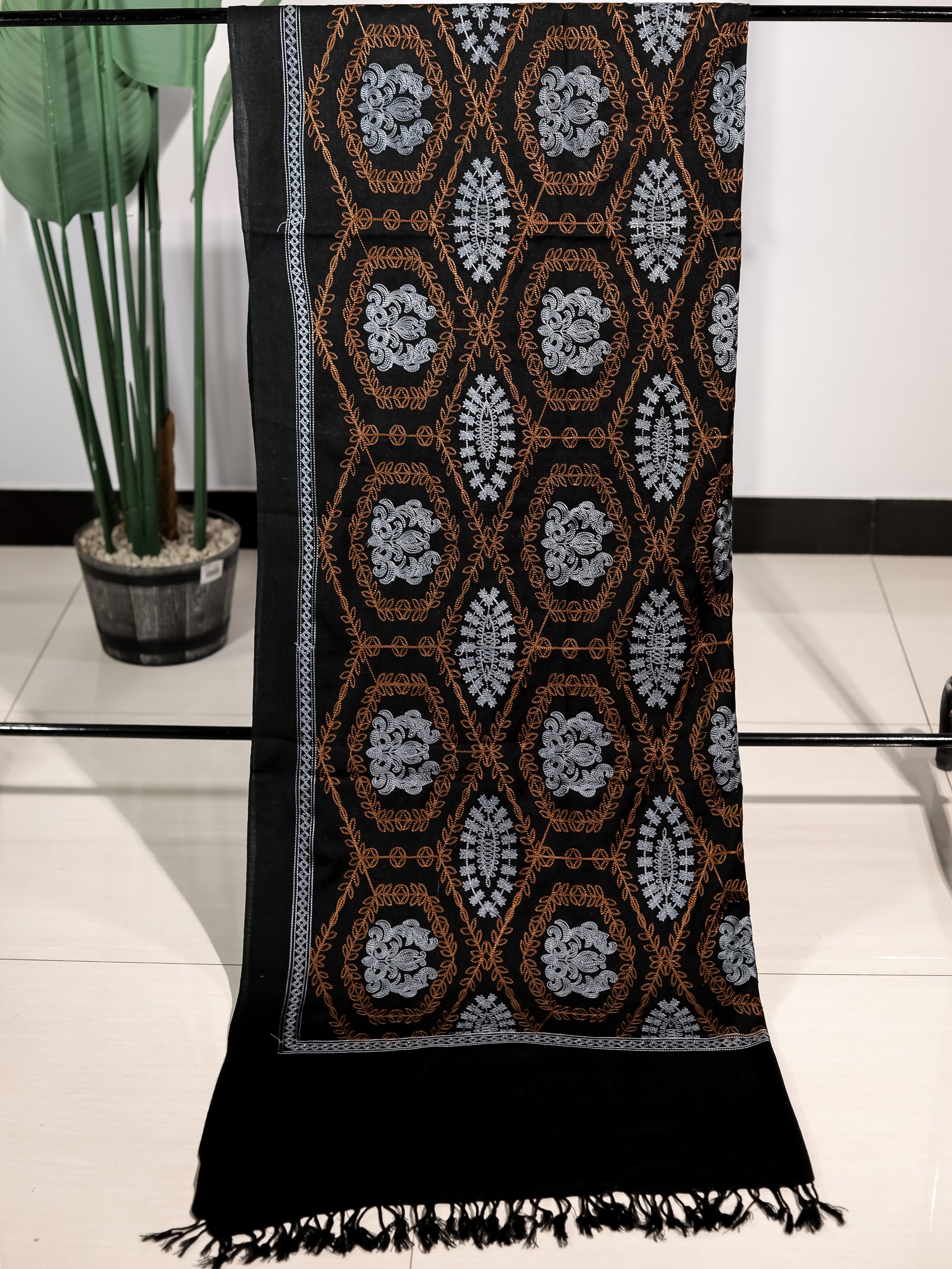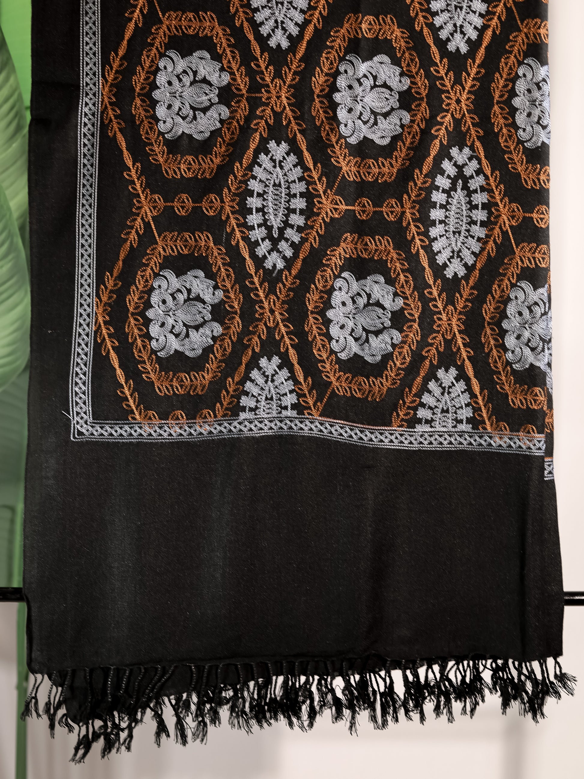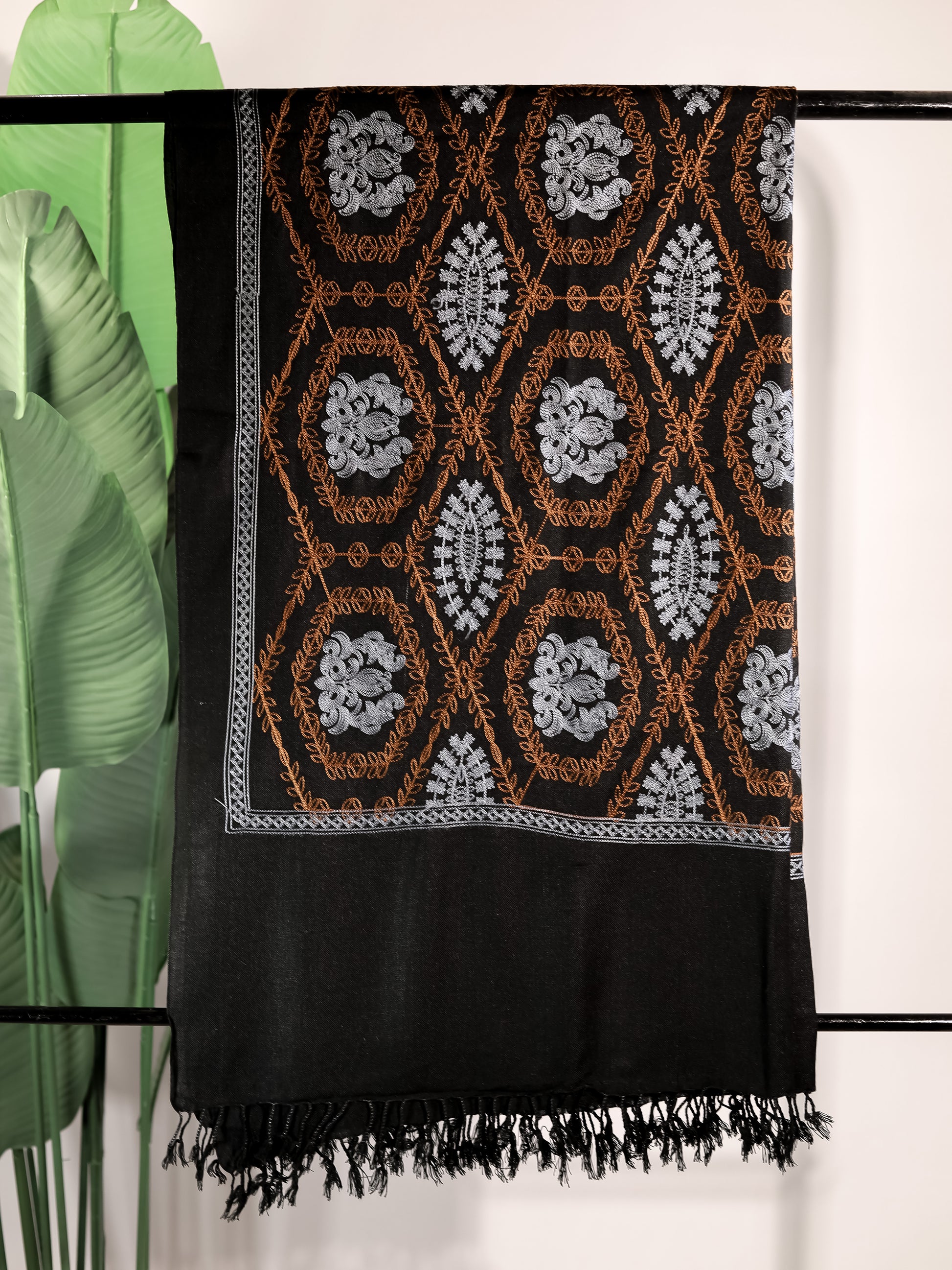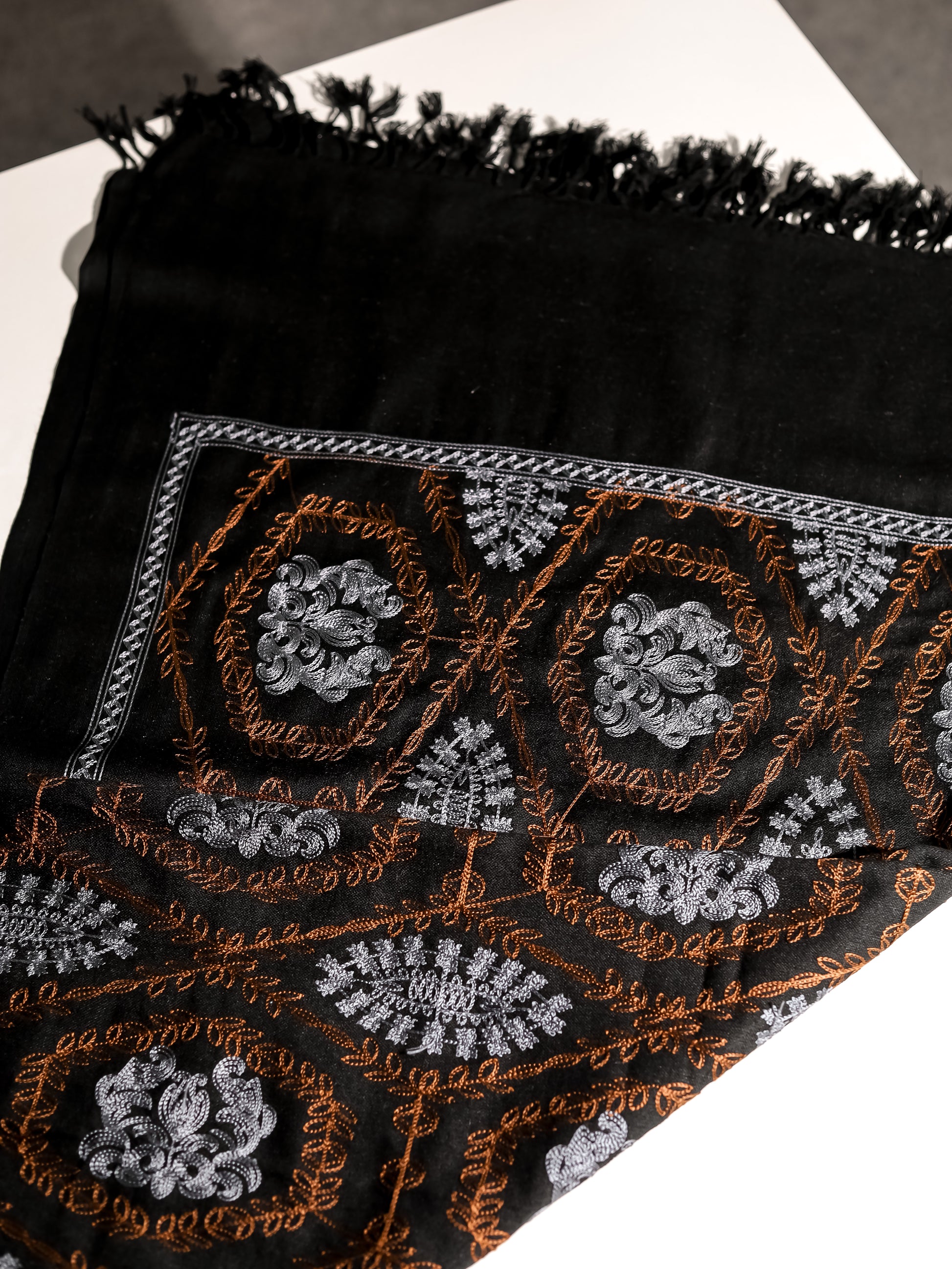 A deep, uninterrupted black shawl that defines sophistication in its purest form.