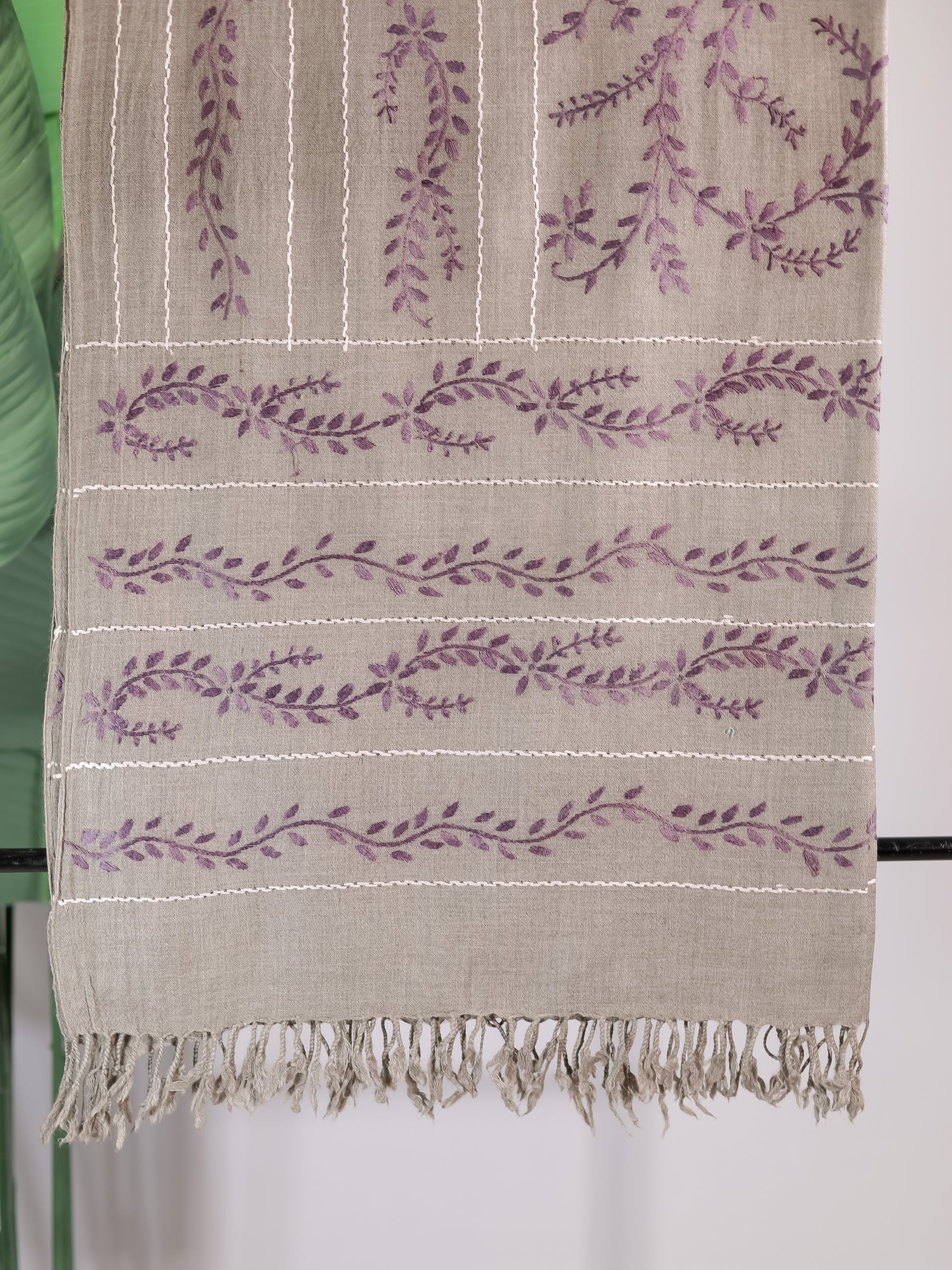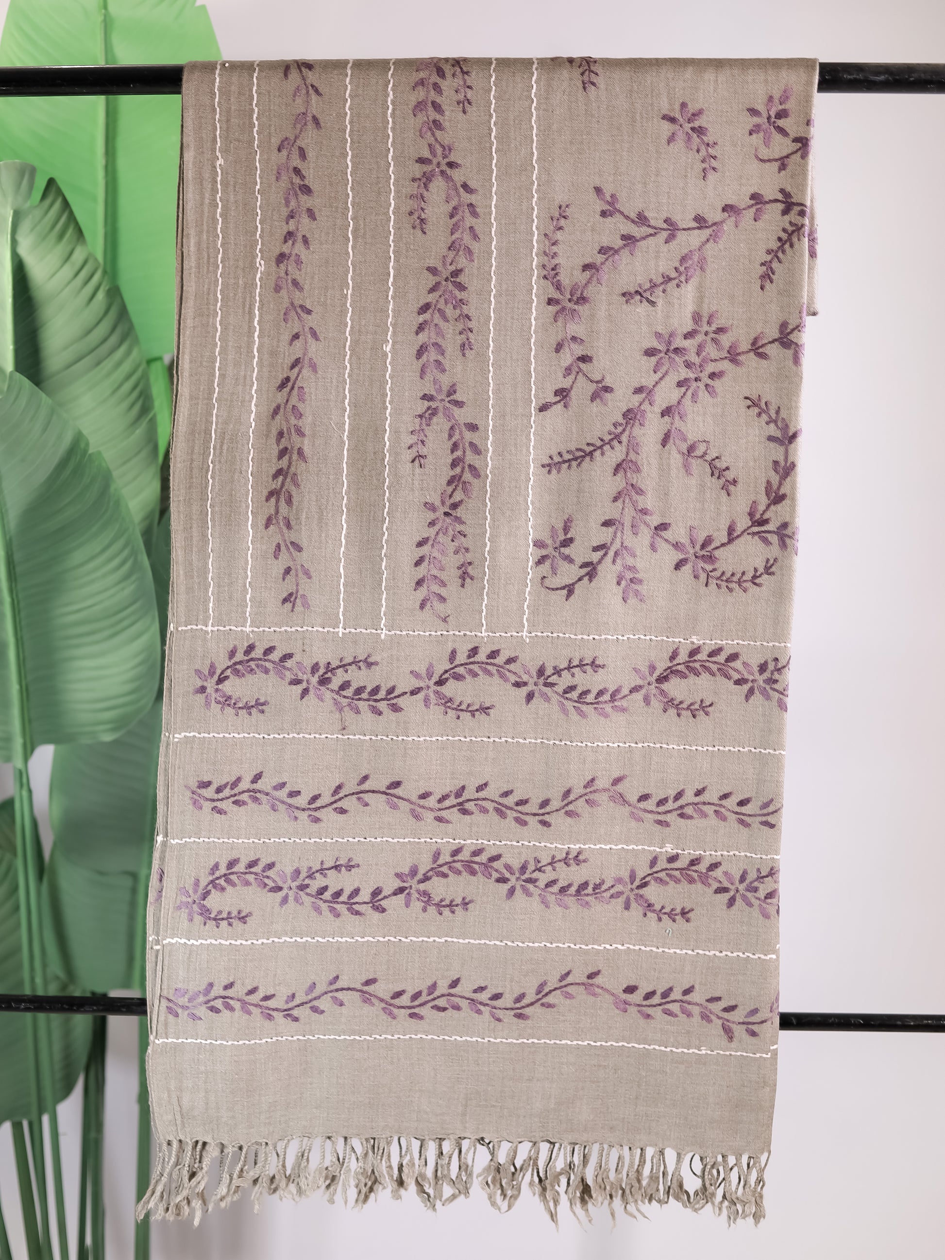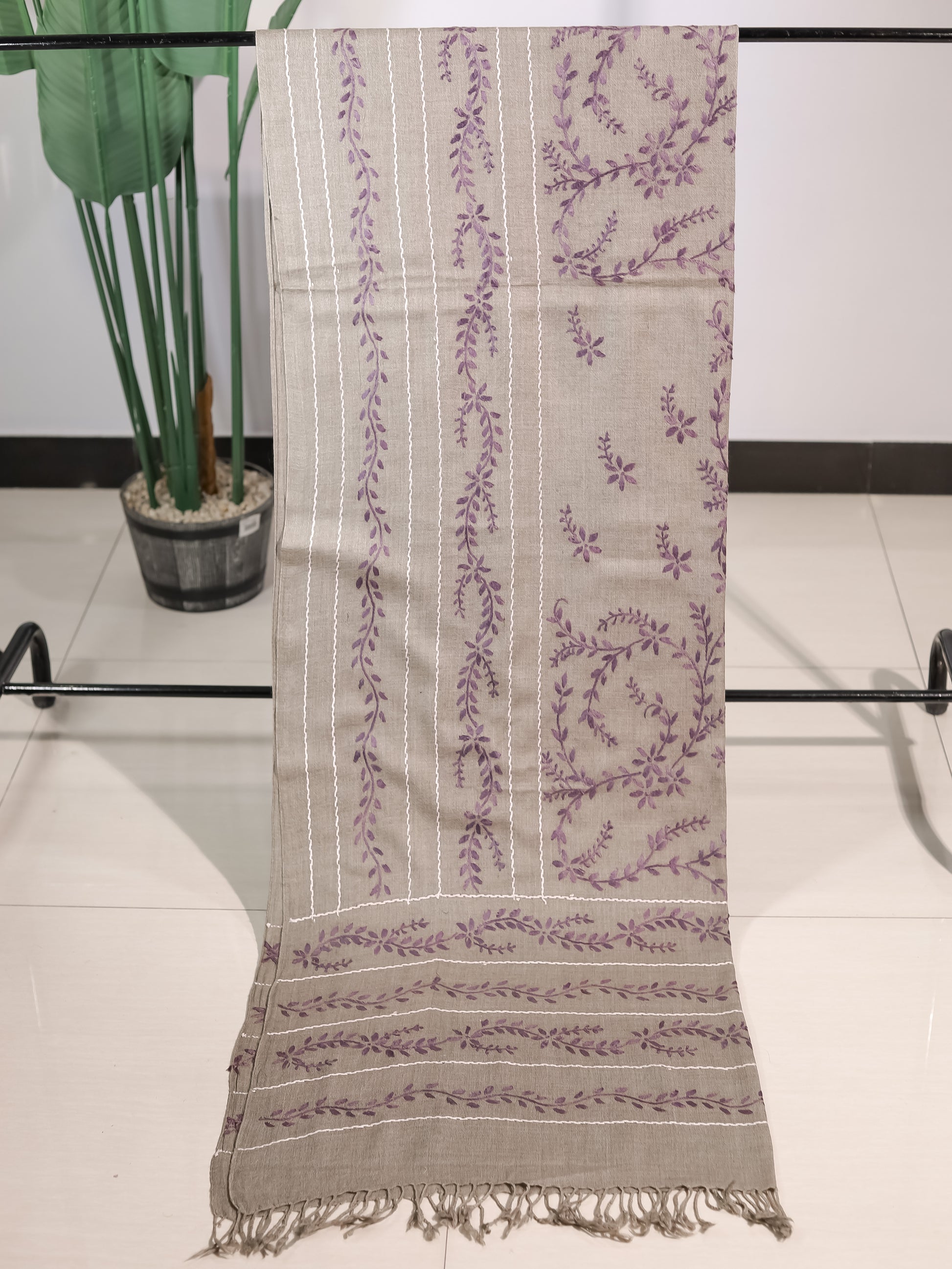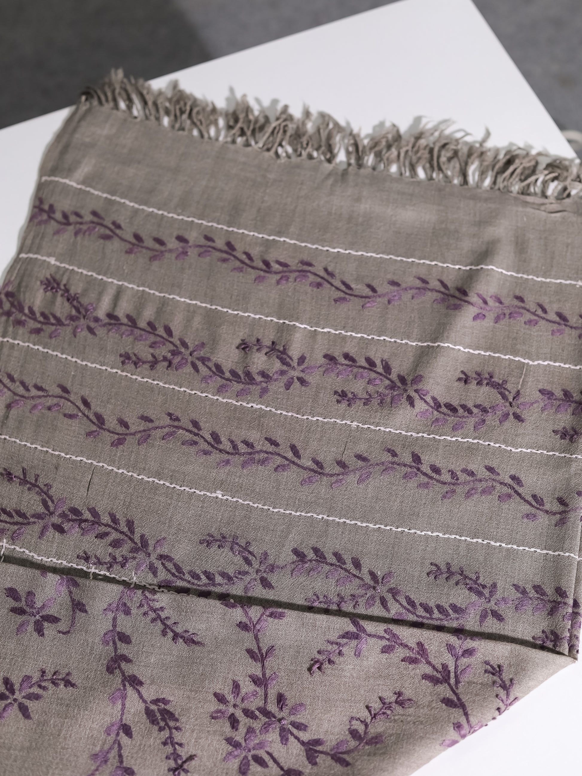 A muted grey base embroidered with vertical lines and floral vines in lavender and ivory threads.
