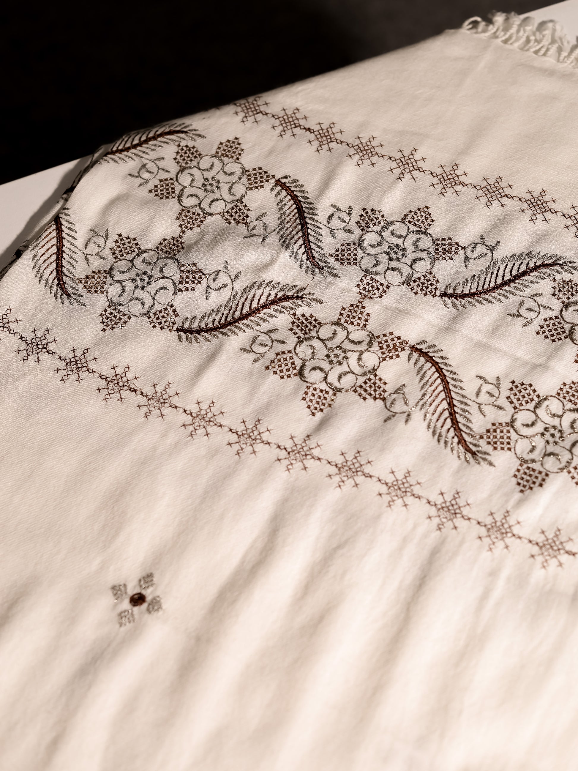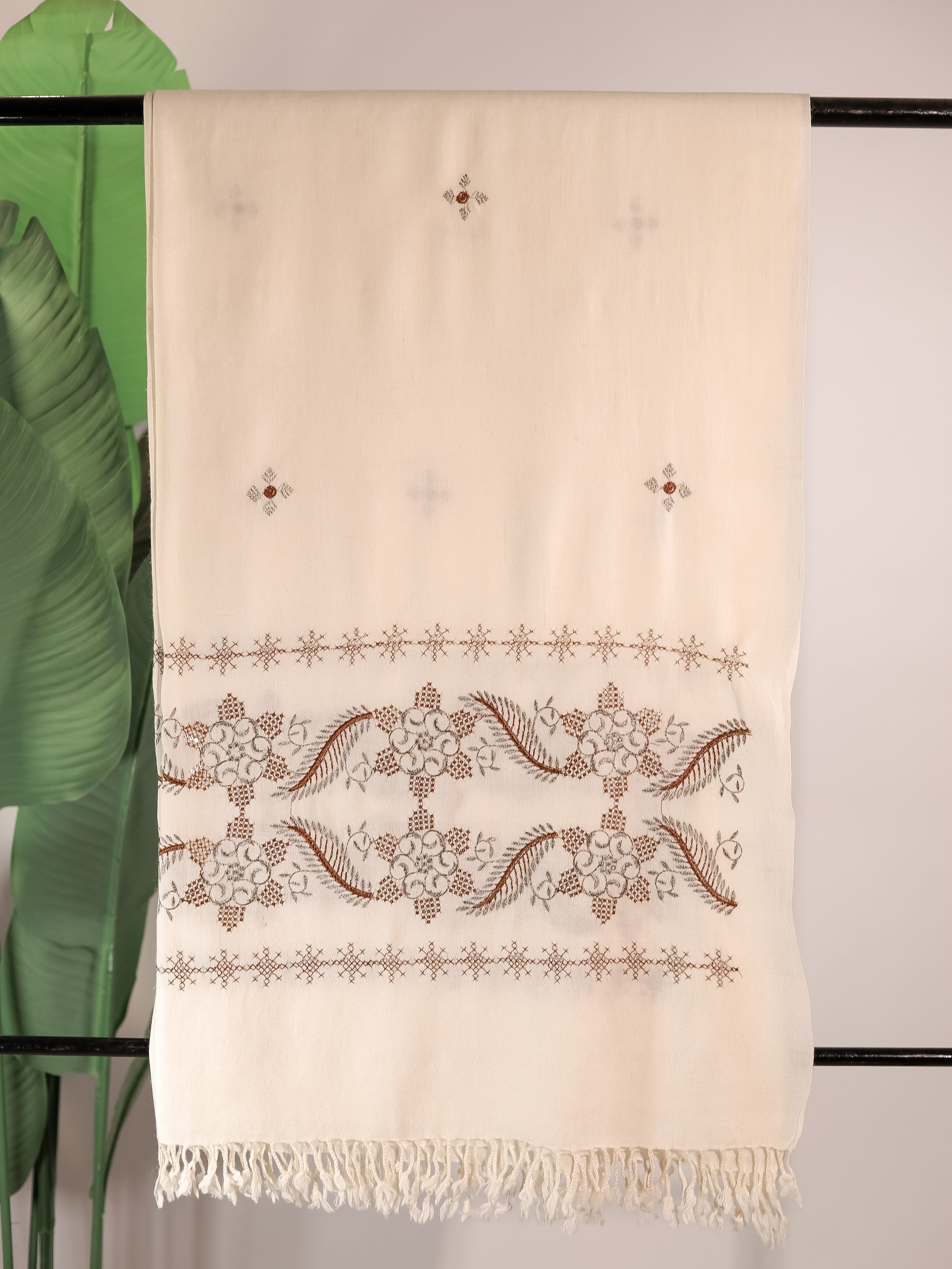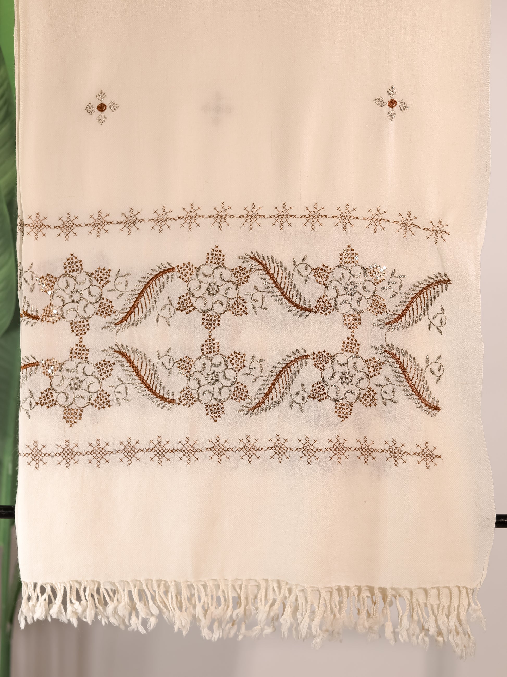 A delicate peach-toned shawl adorned with fine maroon and beige floral embroidery.